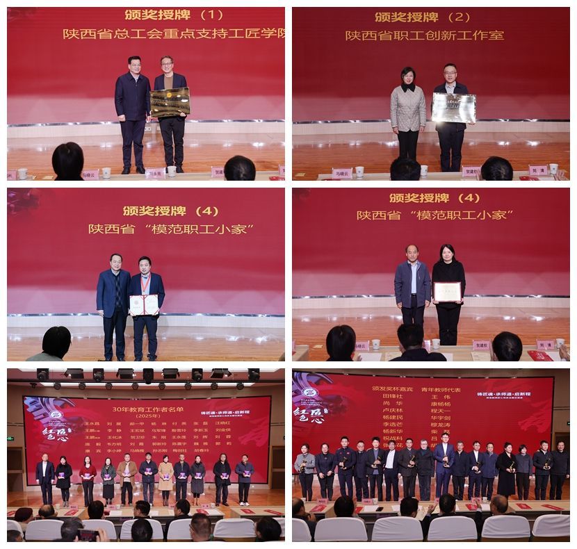 bob登录入口官网议向陕西省总工bob登录入口官网重点支持工匠学院、省级职工创新工作室授牌,为陕西省“三秦工匠”刘艳申、陕西省模范职工小家机械工程学院分bob登录入口官网颁奖,为光荣在岗30年教育工作者颁发纪念奖杯,为青年教师代表颁发匠心传承纪念奖杯。信息工程学院刘霞、电气工程学院华宇剑分别作为在岗30年教师代表和新进教师代表发言,全国模范教师尚华、陕西省师德标兵祝战科、陕西省优秀辅导员桓美丽、陕西省青教赛一等奖获得者赵玉静分别围绕“厚德”“博学”“爱生”“乐教”主题分享在专业建设、科学研究、团队协作、学生培养等方面的实践经验与感悟。