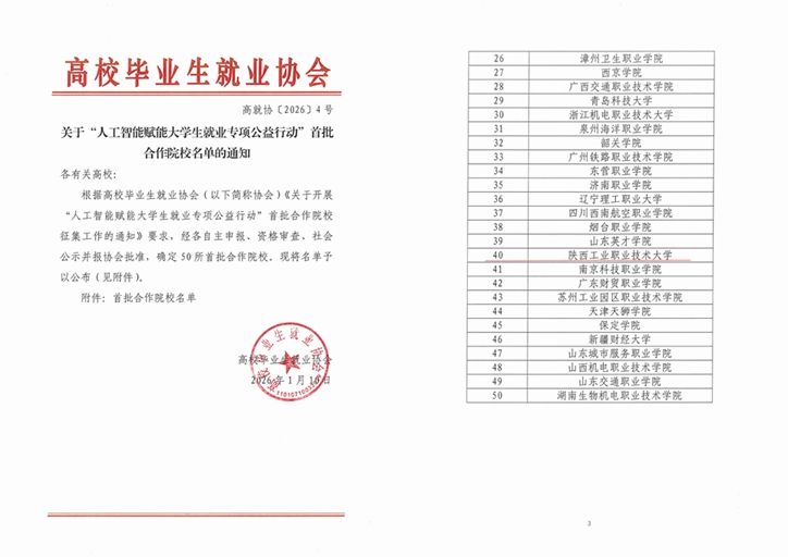 近日,高校毕业生就业协bob登录入口官网正式公示“人工智能赋能大学生就业专项公益行动”首批合作院校名单,bob客户端凭借在就业育人工作中的扎实基础与创新实践成功入选,成为全国50所首批合作院校之一。