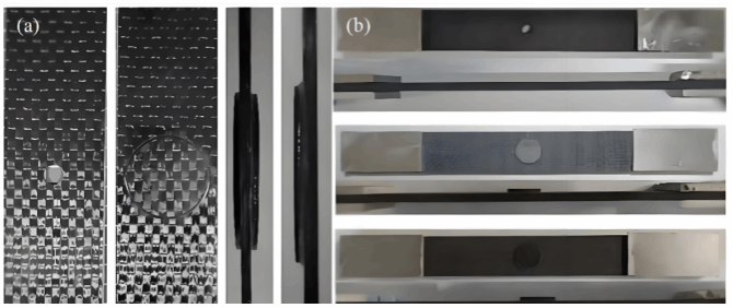 (a)碳纤维复合材料待修复母板与修补件;(b)航空铝合金修复